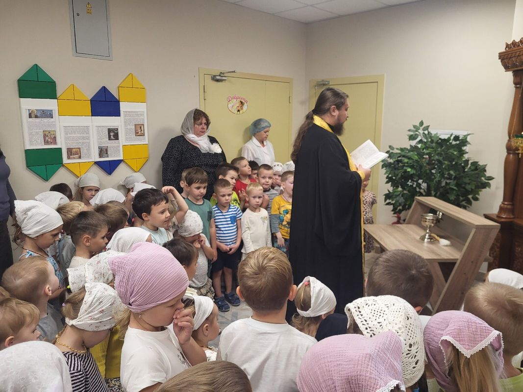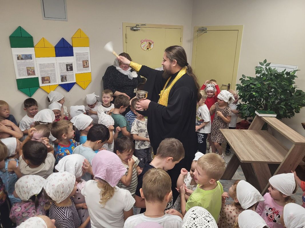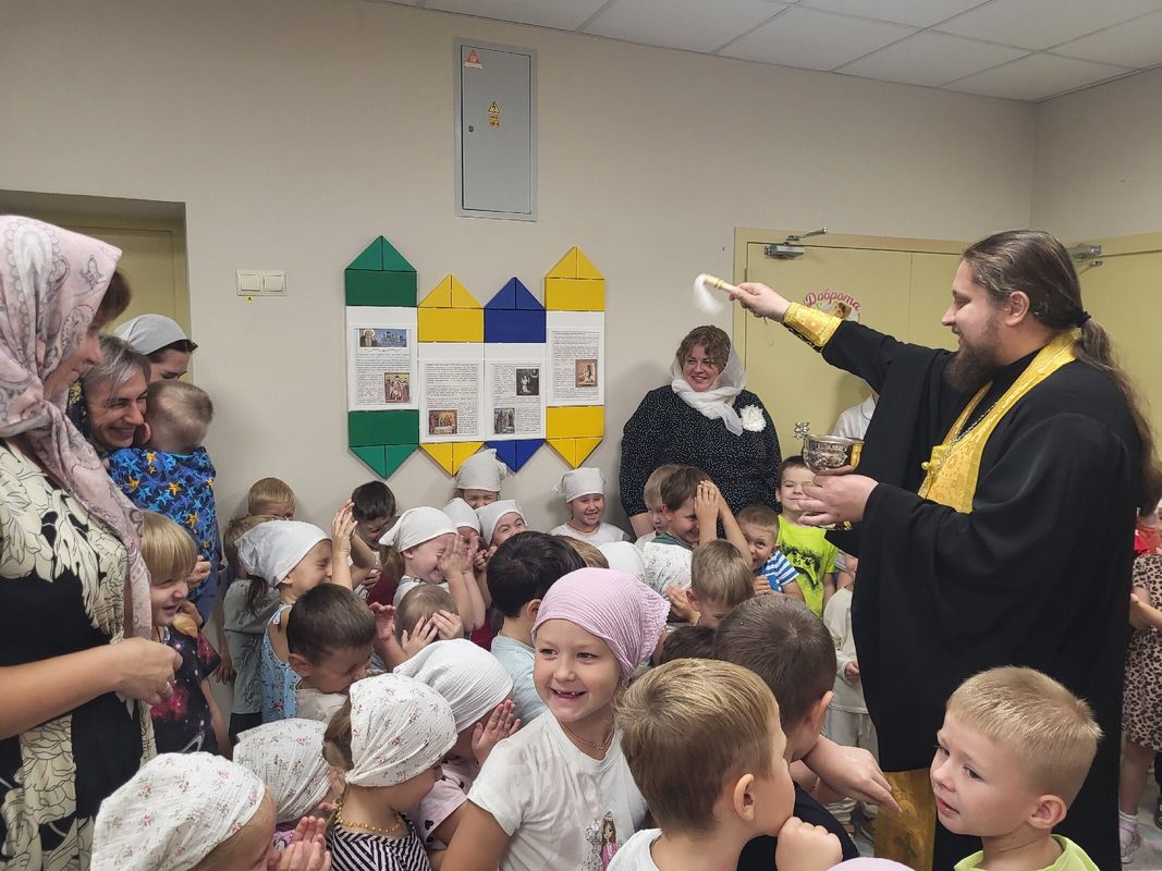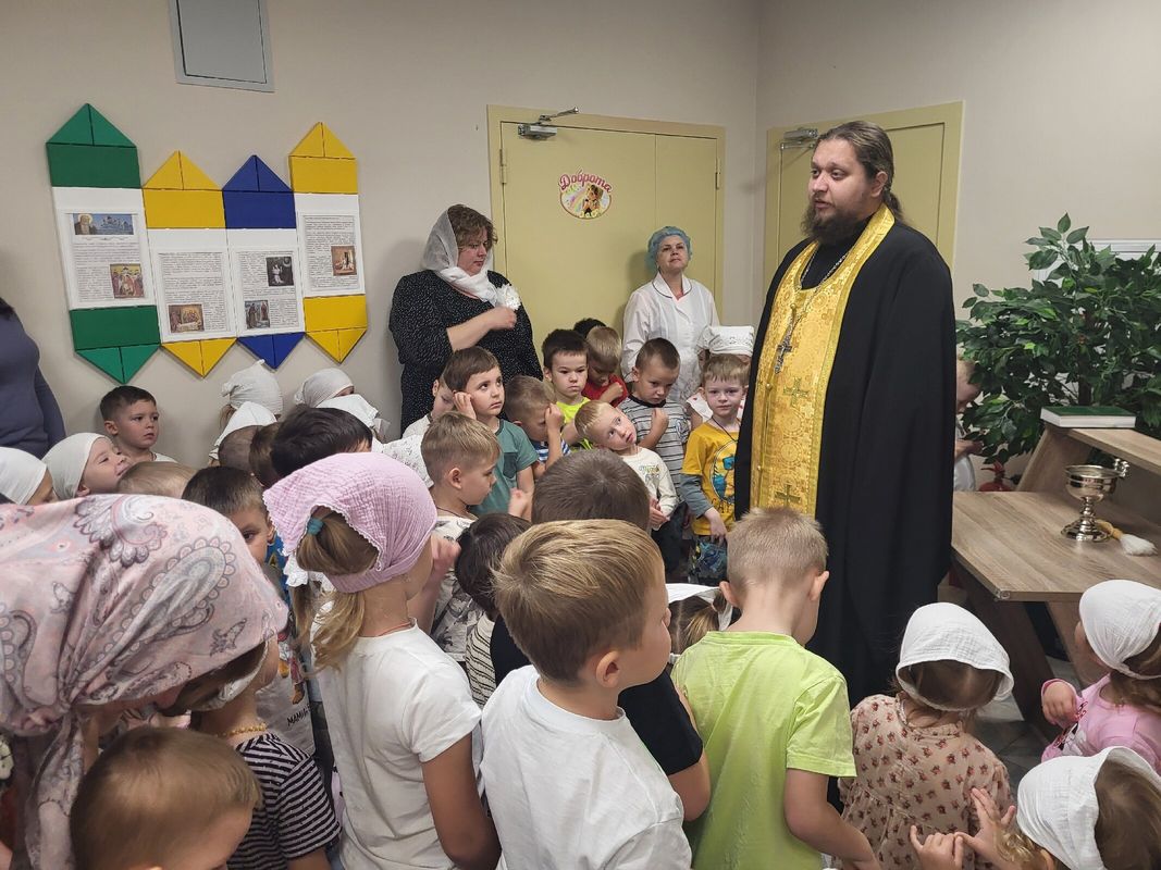 После молебна батюшка окропил святой водой помещения детского сада и провел беседу с детьми из подготовительной группы "Дружба", темой которой стали недавно отмечаемое Новолетие и предстоящий праздник Рождества Пресвятой Богородицы.