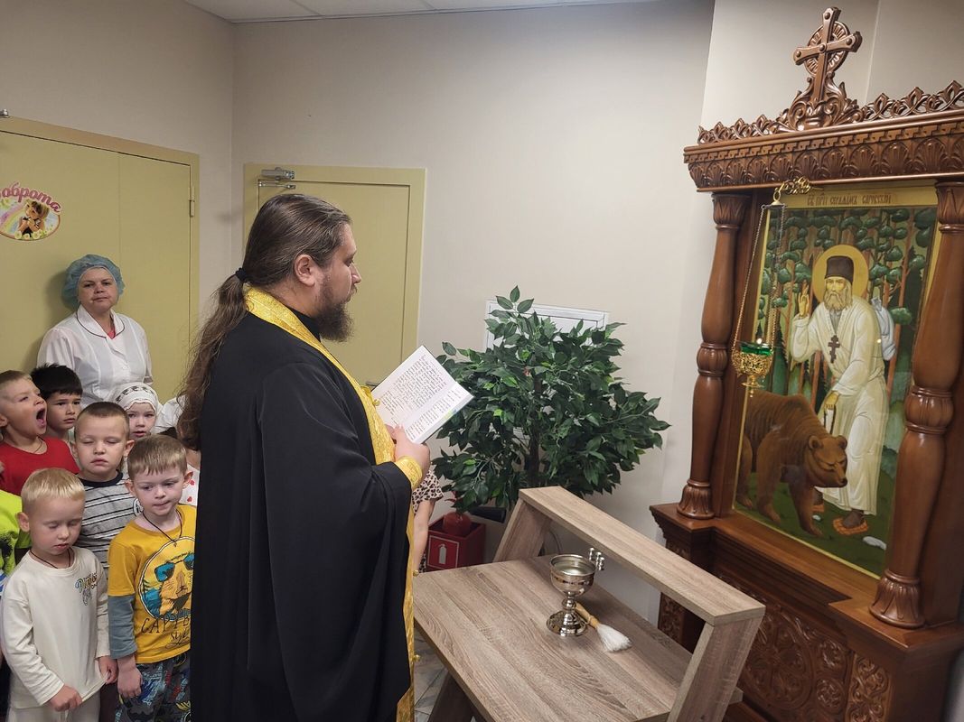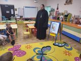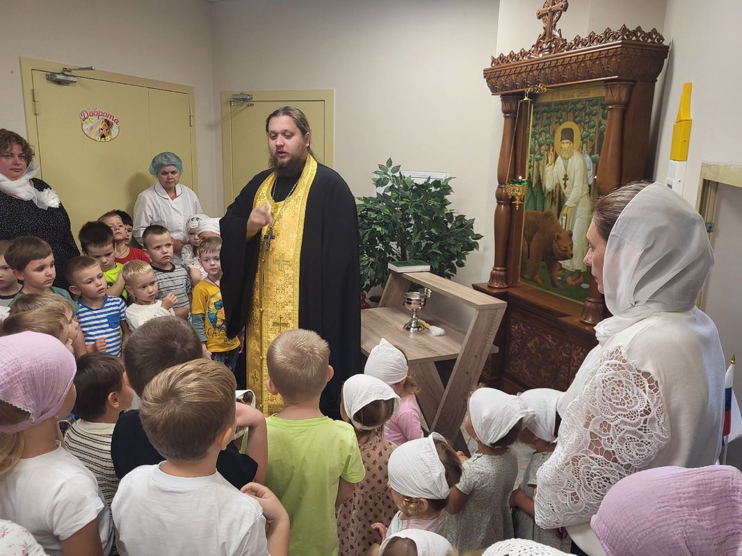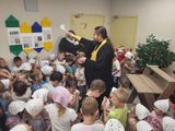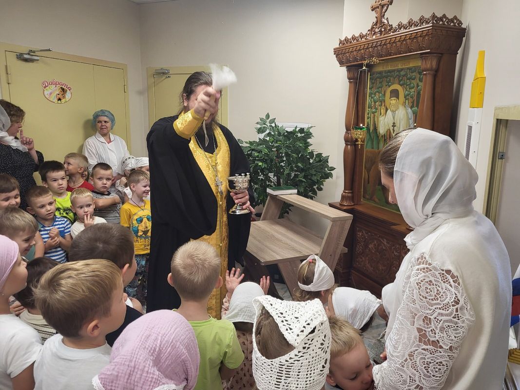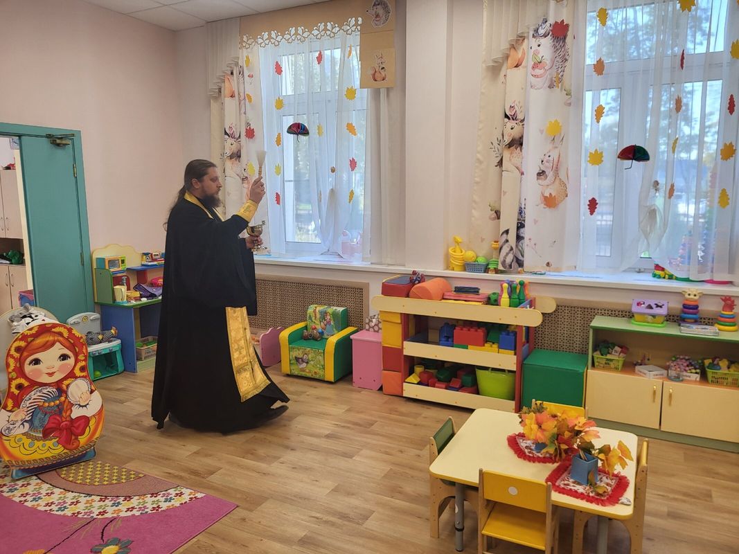 После молебна батюшка окропил святой водой помещения детского сада и провел беседу с детьми из подготовительной группы "Дружба", темой которой стали недавно отмечаемое Новолетие и предстоящий праздник Рождества Пресвятой Богородицы.